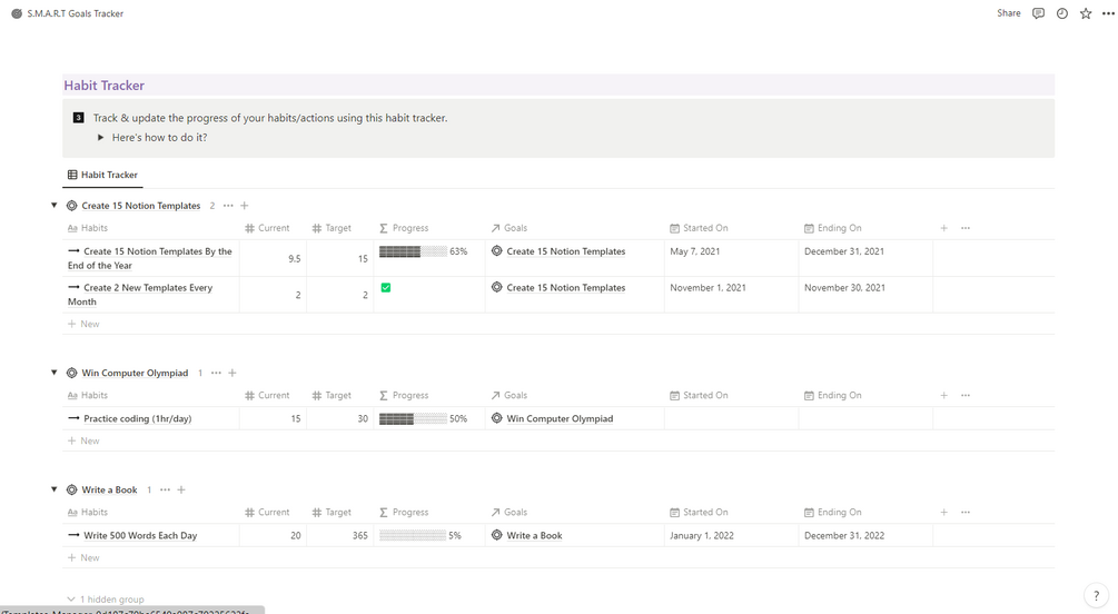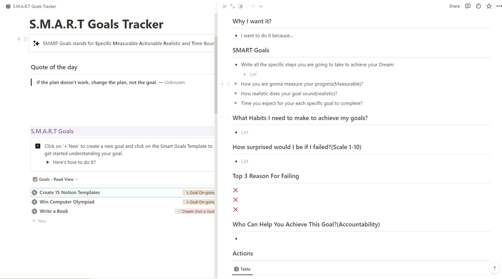 With this template, you can track all your goals, your progress on each of them. Moreover, you could also validate your goal if it's SMART (Specific, Measurable, Achievable, Realistic, and Timely) and execute from day one to get instant result.
